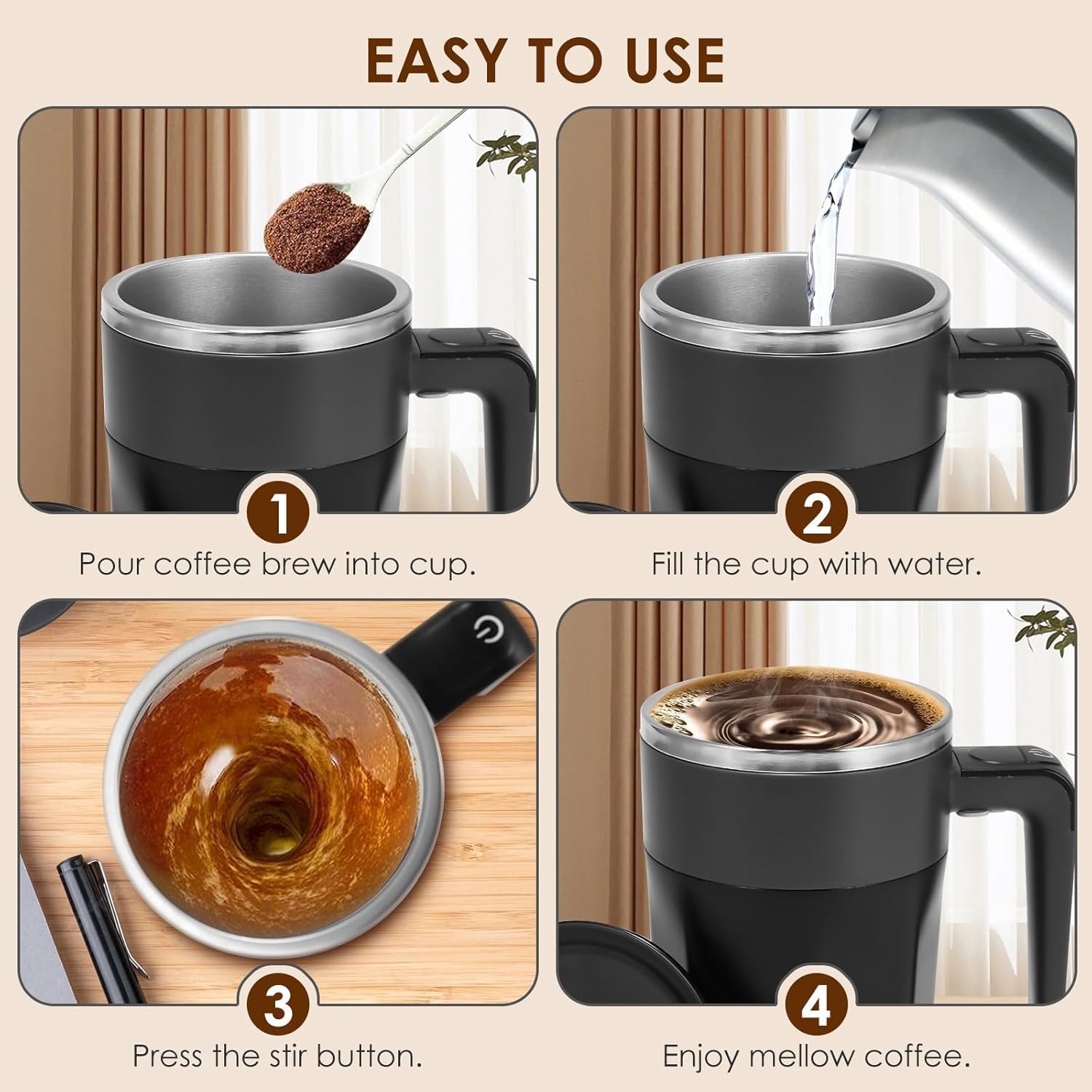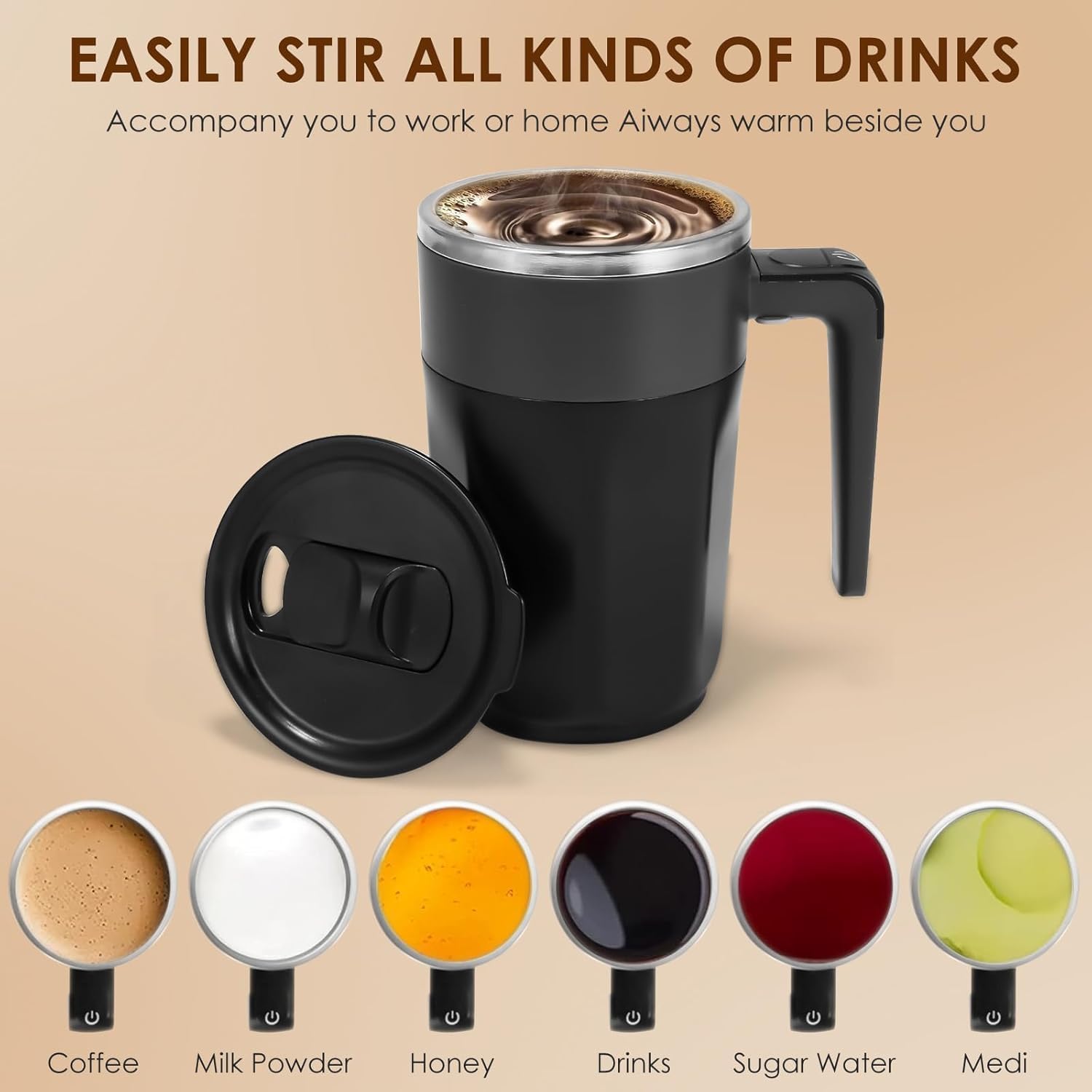 - 🍵【Versatile Use】 With a capacity of 380 ml (13 oz), this auto-stirring coffee cup is perfect for a variety of beverages like coffee, milk, hot chocolate, tea, and more. It's designed for light mixing and is ideal for carrying drinks from one room to another, or even outside the home to the office or gym, providing convenience and ease in your daily routine. Note: Avoid use with thick or solid mixtures that do not dissolve quickly