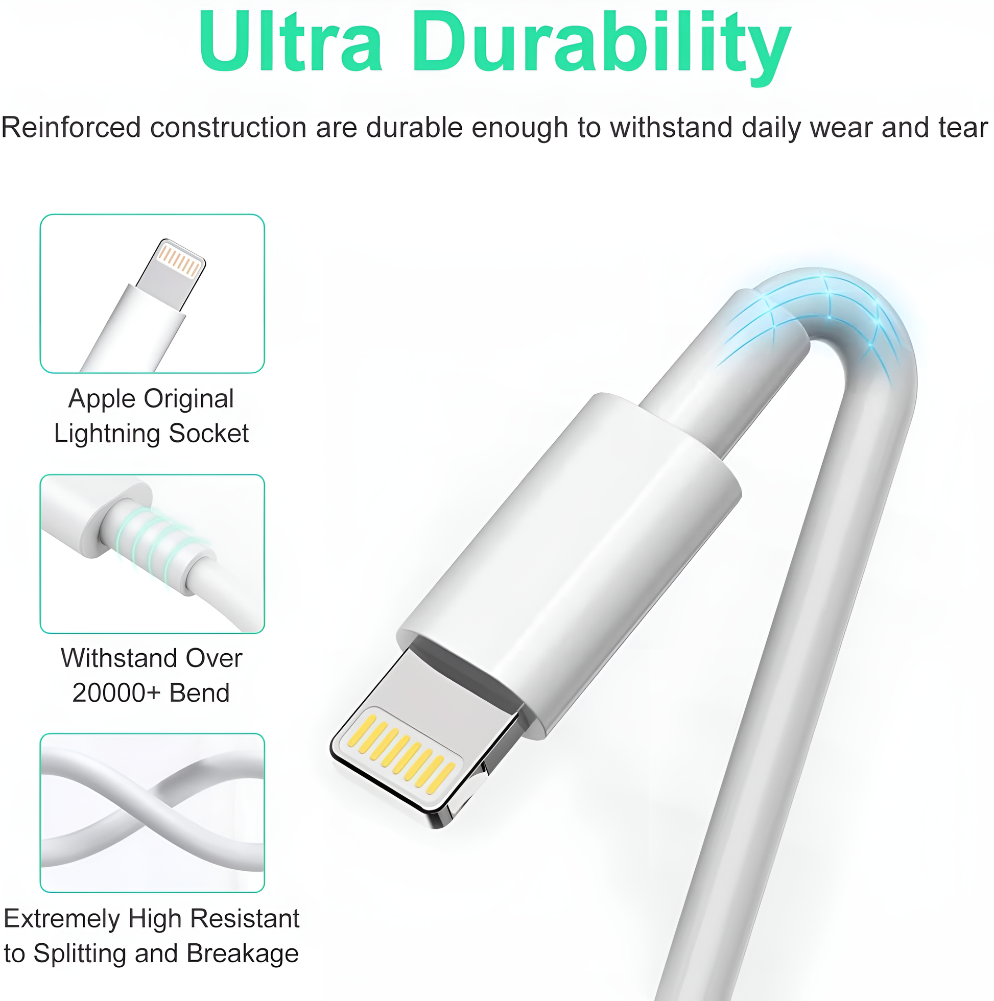 Keywords: Apple Lightning cable, ultra-durable charging cable, 20K bend cable, reinforced iPhone cable, original Apple charger